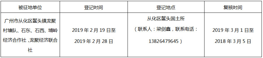 经广州市人民政府同意并经广东省人民政府批准(粤国土资(建)字〔2016〕524号)同意将广州市从化区鳌头镇龙聚村地段2.7426公顷集体土地征收为国有土地。现将经依法批准的《征收土地方案》、广州市人民政府批准的《征地补偿安置方案》内容和有关事项公告如下: