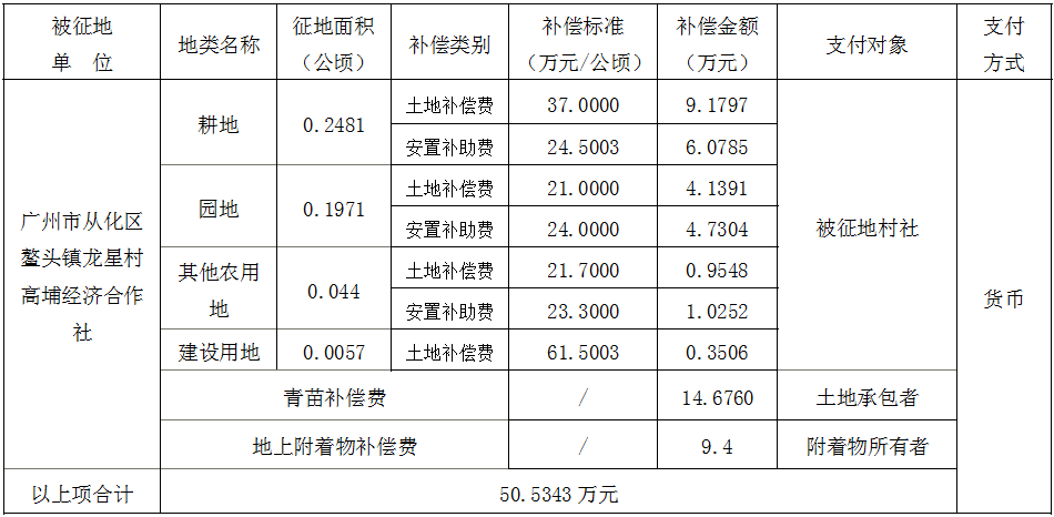 (二)本次征收土地所涉及的被安置农业人员由广州市从化区鳌头镇龙星村高埔经济合作社以货币补偿等形式安置。