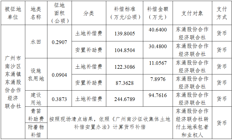 经广东省人民政府批准(粤国土资(建)字〔2017〕576号文),需将南沙区东涌镇东涌股份合作经济联合社0.7684公顷(合11.526亩)集体土地征收为国有土地。现将经依法批准的《征收土地方案》、市人民政府批准的《征地补偿安置方案》内容和有关事项公告如下: