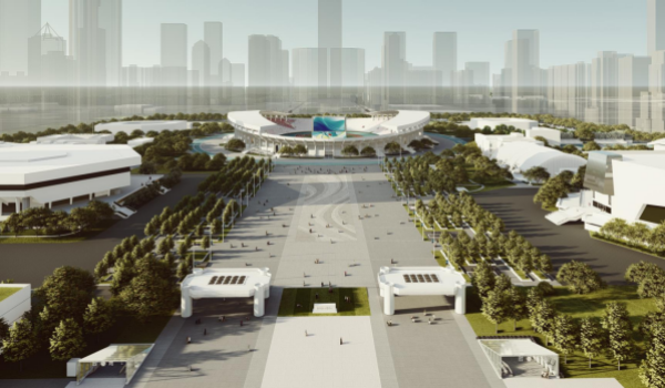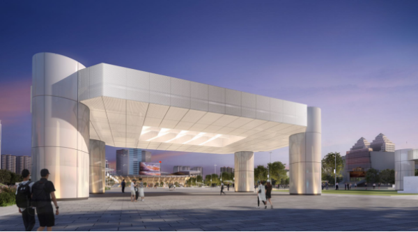 复建工程以“天体之门”为设计概念,既呼应历史风貌,又注入现代元素。造型上延续原门楼简洁大气的白色柱体与顶棚形态,兼顾耐久性与光影效果。技术上主体采用钢结构,结合现代建筑技术提升安全性与功能性。门楼作为连接天河体育中心过去与未来的纽带,象征广州开放包容、创新发展的城市精神,强化新中轴线空间序列的整体感。