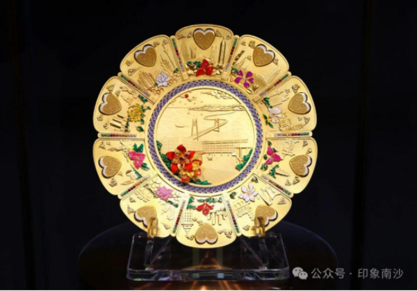 镇馆之宝“湾区同心” :以粤港澳大湾区11座城市市花、地标建筑为元素,融合花丝、镶嵌、珐琅三大非遗绝技。 仅花丝工艺便耗用800段金线,总长逾5公里。