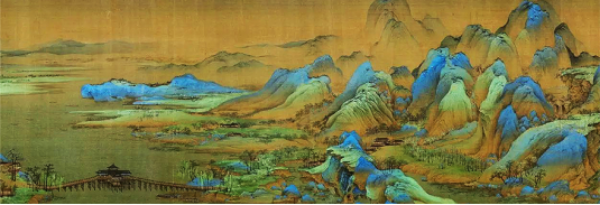 北宋《千里江山图》矿石墙绘 :采用蓝铜矿、孔雀石、朱砂等天然矿物颜料,还原画作原色,复刻北宋青绿山水神韵。